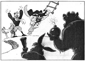 Aside from Darkwing himself, only a little bit is known about the creative developments after the pitch was approved. Artwork from this period suggests that Taurus Bulba was conceived as a much bigger opponent with a grand office and well-armed troops. Given that F.O.W.L. as a heritage from DuckTales always was going to be an element, it's probable Bulba was supposed to be its leader, which would explain that he indeed is in the 1991 booklet "The Darkest Night". J. Gander Hooter, Gumbo, and Major Synapse are included too, but Synapse is noticeably more gentle-looking than his final form.[8] At some point Taurus Bulba was removed from F.O.W.L. to make room for Steelbeak, who was designed around a voice Rob Paulsen did while kidding around.[7] Sometime later in the development, Steelbeak, Tuskerninni, Megavolt, and Bushroot were selected as primary or exemplary villains,[9][10] which is reflected in the 1991 Disney Comics editorial and the 1991 short-lived Playmates line. How this decision is to be understood in light of the first set of episodes is unclear. While multiple scripts were worked on at the same time, the one for "That Sinking Feeling" was finished first as pilot script and the episode was also the first to be animated.[4] This episode has Moliarty as the main villain and while Steelbeak and Tuskerninni are part of the villain lineup of the first thirteen production codes, Bushroot and Megavolt don't come in until the second set. In fact, all of the first ten produced episodes star a different villain, most of which only got used once or twice. Anna Matronic was created and dropped during this time while Morgana Macawber, starting as a villain wielding magic, became a love interest as the script took form.[7] The gas gun also went through some developments, starting as a gun which ammo literally is a huge collection of various gases, as it still is in early fiction like "That Sinking Feeling", the Playmates description, "Darkwing Duck and the Robot Plants", and the NES game, and becoming more of a multi-purpose weapon also capable of firing grappling hooks and Christmas decoration. At least as late as October of 1990, the countenance details of Launchpad and Darkwing were improved on.[11]