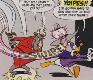 The Suits assist Pokerface in a scheme to poison the water supply for One Chump Plaza Casino with gambleholic toxin to make the patrons spend all they have. Darkwing Duck picks up their trail when the kill the city controller and crashes Pokerface's office. The four beat and tie him and Launchpad up, then leave with Pokerface to the water tank on the roof. Darkwing won't stay put, though, and comes after them. Because Darkwing himself has fallen victim to the gambleholic toxin, Launchpad has to bet him he can't defeat them to make sure he has a chance. Diamond is the third to deal with the caped crusader, slashing at the hero and cutting his hat in two while Darkwing makes a run for it. He chases him to the ladies' room, where the door opening is blocked by a large patron. She spots Diamond behind Darkwing and, instantly taking a liking to him, jumps into his arms, squashing him. "Feeling Flushed"