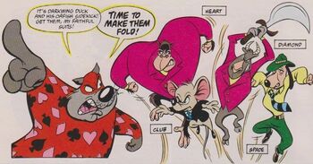 The Suits assist Pokerface in a scheme to poison the water supply for One Chump Plaza Casino with gambleholic toxin to make the patrons spend all they have. Darkwing Duck picks up their trail when the kill the city controller and crashes Pokerface's office. The four beat and tie him and Launchpad up, then leave with Pokerface to the water tank on the roof. Darkwing won't stay put, though, and comes after them. Because Darkwing himself has fallen victim to the gambleholic toxin, Launchpad has to bet him he can't defeat them to make sure he has a chance. Darkwing uses Heart's size against him, tricks Club, get unexpected assistance from a patron against Diamond, and thrashes Spade when he makes a rude comment about the crimefighter's choice of wardrobe. Pokerface fares a little better, but not enough for them to escape jailtime. "Feeling Flushed"